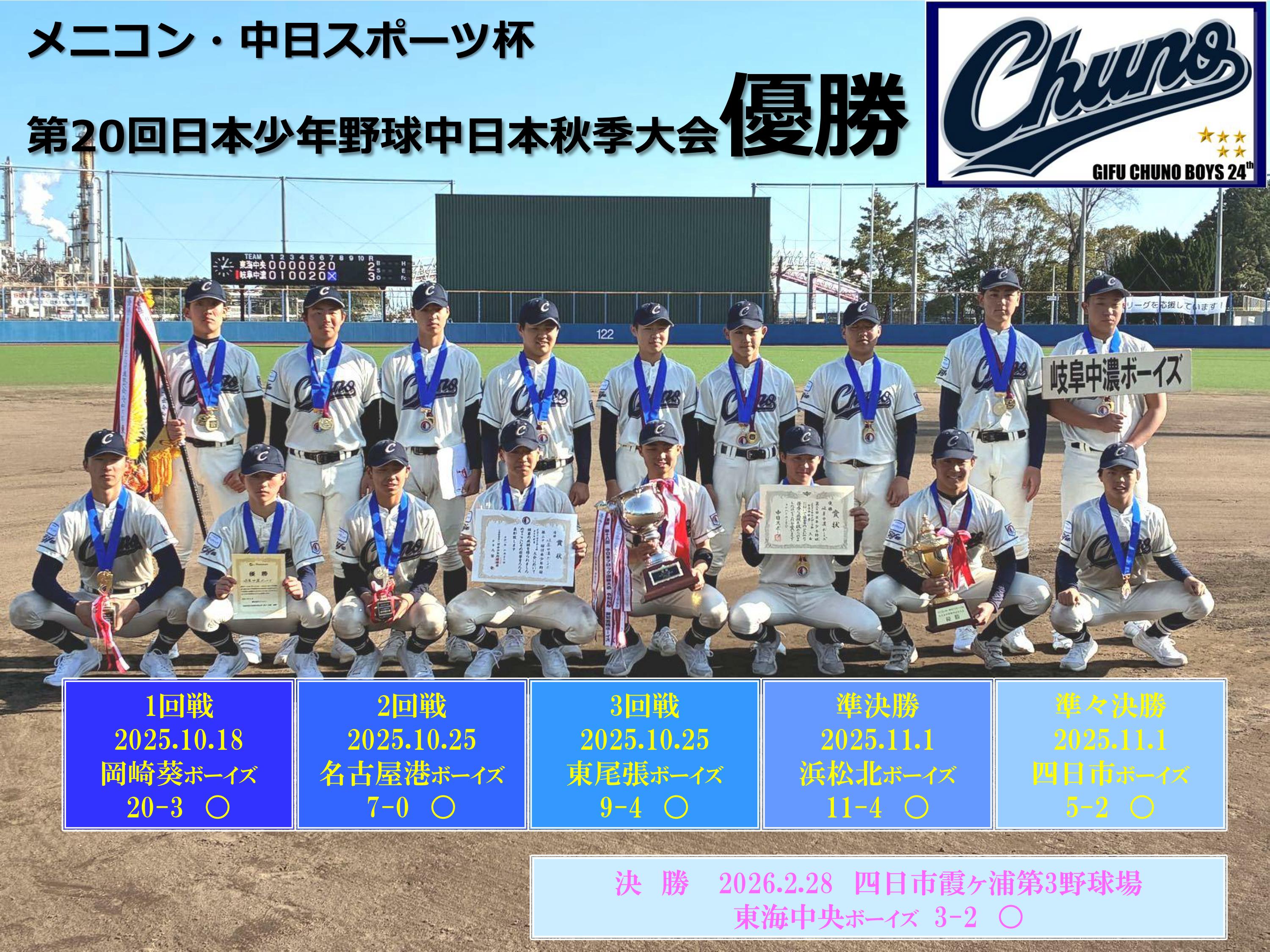 岐阜中濃ボーイズは11月に行われました第56回春季全国大会岐阜県支部予選において優勝し、昨年に続いて全国大会出場が決まりました。つきまして、協賛金の募集をさせていただきます。暖かいご支援、ご協力をお願い申し上げます。全国大会は2026年3月26日から東京周辺で行われます。